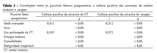 Houve uma significativa correlação entre idade avançada e culturas positivas das amostras de CT e sangue (r = 0,512 e r = 0,312, respectivamente; p < 0,05 para ambas). Entretanto, sexo não apresentou correlação significativa com culturas positivas de nenhum dos tipos de amostras (p > 0,05 para ambos). Também houve uma correlação significativa entre uso prolongado de CT e culturas positivas das amostras de sangue e CT (r = 0,347 e r = 0,372, respectivamente; p < 0,05). Houve uma correlação significativa entre o status cirúrgico dos pacientes (aqueles submetidos a cirurgias) e culturas positivas das amostras de CT (p < 0.05), mas não das amostras de sangue (p > 0,05).