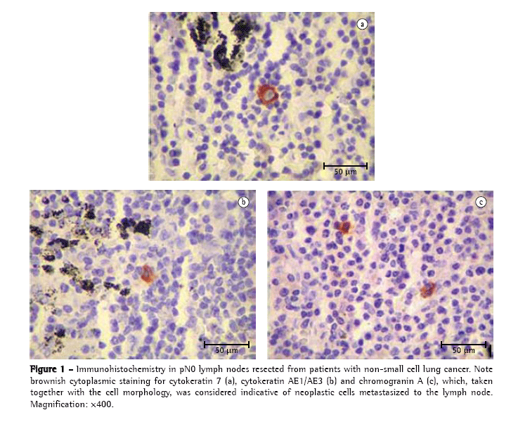 In recent years, various authors have successfully employed the immunohistochemical staining method to detect micrometastatic tumor cells in lymph nodes,(15-17) bone marrow, and peripheral blood.(18,19) However, the cost of analyzing all lymph nodes by this method is quite high, since the detection of micrometastases, especially in patients with stage I tumors, requires that multiple sections be evaluated, which involves large-scale immunohistochemical staining.