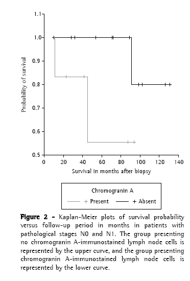 The Kaplan-Meier survival curves presented in Figure 2 show that survival was lower among the patients presenting chromogranin A-stained micrometastatic tumor cells in the lymph nodes than among those without such micrometastases, and this difference was of borderline significance (p = 0.05). Considering survival in a multivariate analysis adjusted for age, gender, histological type, and restaging, the survival rate was 7-fold higher in the absence of micrometastases for patients younger than 57 years with adenocarcinoma. The relative risks for these predictors are shown in Table 2.