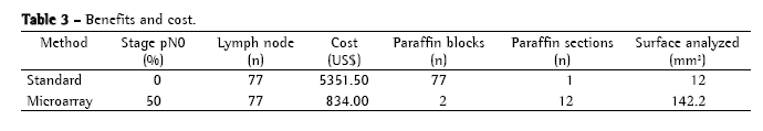 The paraffin blocks containing the lymph node sections were submitted to serial sections with the objective of increasing the surface area of the sections for diagnosis. Twelve 3- to 4-µm thick sections were obtained from the two blocks. These new sections presented broader areas for examination, totaling 142.2 mm2 per lymph node. Table 3 shows the comparison between tissue microarray analysis and the standard method for lymph node analysis in terms of advantages and cost.
