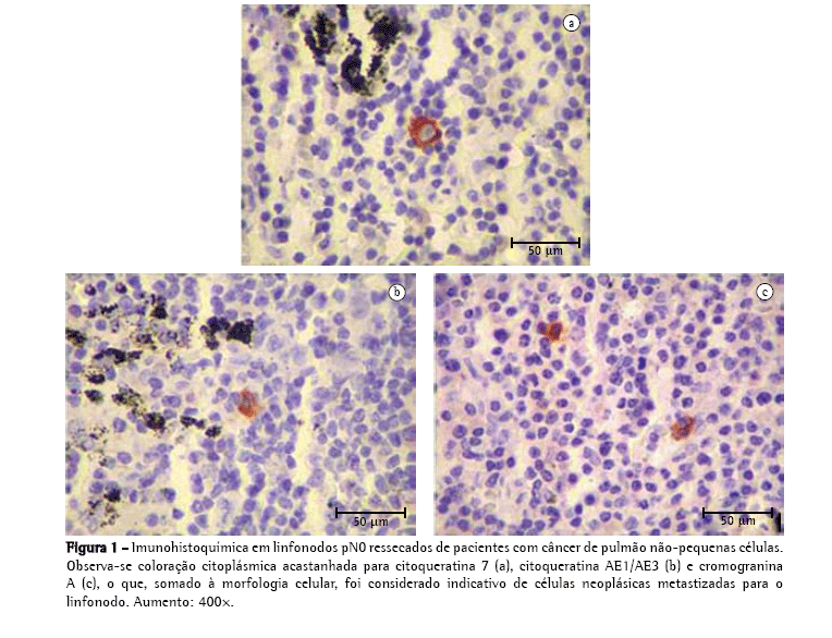 Nos últimos anos, vários autores empregaram, com sucesso, o método de coloração imunohistoquímica para detectar células tumorais micrometastáticas nos linfonodos,(15-17) na medula óssea e no sangue periférico.(18,19) Contudo, o custo de se analisar todos os linfonodos por esse método é bem alto, uma vez que a detecção de micrometástases, especialmente em pacientes com tumores estádio I, requer a avaliação de múltiplos cortes, o que envolve a utilização de coloração imunohistoquímica em larga escala.