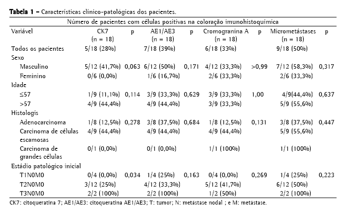 O reestadiamento do estado nodal foi realizado com base na combinação da coloração imunohistoquímica com citoqueratina e com cromogranina. Entre os pacientes estadiados como pN0 com base na coloração com hematoxilina-eosina, 9 (50%) foram reestadiados como N1. Os dados clínicos e morfológicos foram reavaliados quanto a associações e também quanto à recidiva e à sobrevida. A presença de células tumorais metastáticas positivas para CK7 nos linfonodos pN0 estava significativamente associada ao estádio patológico (p < 0,05), como pode ser visto na Tabela 1, a qual também mostra a distribuição das demais características clínicas dos pacientes. Não houve associações significativas para a imunocoloração com AE1/AE3 ou com cromogranina A nos linfonodos pN0.