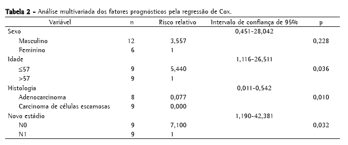 As curvas de sobrevida de Kaplan-Meier apresentadas na Figura 2 mostram que a sobrevida foi mais baixa entre os pacientes com células tumorais micrometastáticas coradas para cromogranina A do que entre aqueles sem tais micrometástases, sendo essa diferença de significância limítrofe (p = 0,05). Considerando-se a sobrevida em uma análise multivariada ajustada para idade, sexo, tipo histológico e reestadiamento, a taxa de sobrevida foi 7 vezes maior na ausência de micrometástases para pacientes abaixo de 57 anos com adenocarcinoma. Os riscos relativos para esses preditores são mostrados na Tabela 2.