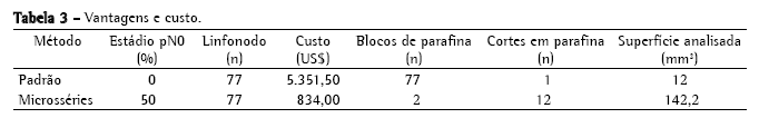 Os blocos de parafina contendo os cortes linfonodais foram submetidos a cortes seriados com o objetivo de aumentar a área dos cortes para o diagnóstico. Doze cortes com 3- a 4-µm de espessura foram obtidos dos dois blocos. Os novos cortes apresentaram áreas mais amplas para o exame, totalizando 142,2 mm2 por linfonodo. A Tabela 3 mostra a comparação entre a análise de microsséries de tecido e o método padrão para análise de linfonodos em termos das vantagens e do custo.