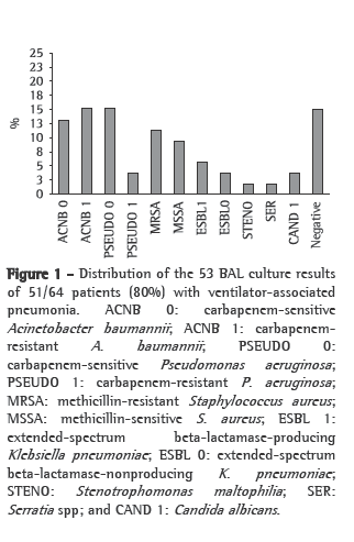 Quantitative BAL cultures were used to analyze the etiologic profile of VAP. The cut-off point for infection was set at 104 UFC/mL.(9,11) The antibiotic therapy initially prescribed was considered appropriate when the pathogens isolated were sensitive to at least one drug in the regimen.