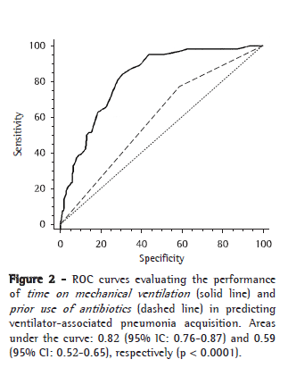 In the present study, the independent risk factors for the development of VAP identified using multivariate analysis were time on MV and prior use of antibiotics. Based on the analysis of the ROC curve, we can conclude that, of these two variables, although prior use of antibiotics has an OR that demonstrate a closer relationship with VAP acquisition, time on MV has greater reproducibility, with higher sensitivity and higher specificity, and this is revealed by the area under the curve above 0.8, for the cut-off point of 12 days.