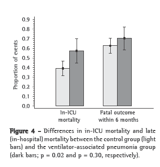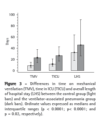 The present study, through the prospective follow-up of patients submitted to MV in the ICU of a private hospital in the city of Rio de Janeiro, Brazil, can be included in this context. Comparing the subgroup of patients who developed VAP with the remaining patients, we sought to determine the impact of VAP on the prognosis of the patients submitted to MV by assessing the following primary outcomes: in-ICU mortality rate; time on MV; time in ICU; and overall length of hospital stay. The secondary outcomes assessed were in-hospital mortality, risk factors for VAP acquisition, microbiological profile and prior use of antibiotics.