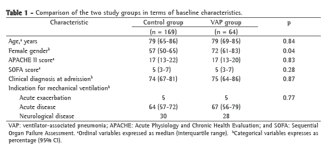 The population in the two study groups was found to be homogeneous in terms of baseline characteristics. The only demographic datum that revealed a significant difference was gender, with a predominance of females in the VAP group. It is important to emphasize that most patients in both groups were older than 79 years of age, which is likely a reflection of the demographic characteristics of the region in which the hospital is located, namely Copacabana, where there is the highest concentration of elderly individuals in the city of Rio de Janeiro-24.8% of the population is over 60 years of age.(18) Regarding admission diagnosis, more than 60% of the patients belonged to the clinical category, and there was no difference between the groups in terms of distribution.