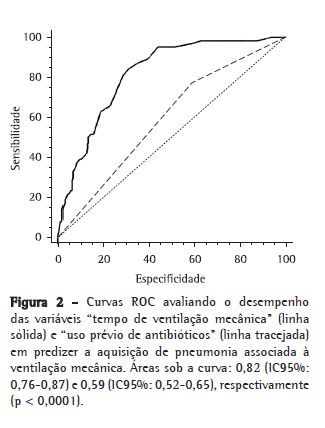 A análise de regressão logística múltipla demonstrou que o tempo de VM (OR = 1,07; IC95%: 1,05-1,10, p < 0,0001) e o uso prévio de antibióticos (OR = 2,36; IC: 1,12-4,99, p = 0,023) foram fatores de risco independentes para o desenvolvimento de PAVM. Avaliando-se o desempenho dessas variáveis pela curva ROC, observou-se, respectivamente, uma área sob a curva de 0,82 (IC95%: 0,76-0,87) e de 0,59 (IC95%: 0,52-0,65) para o tempo de VM e para o uso prévio de antibióticos (Figura 2).