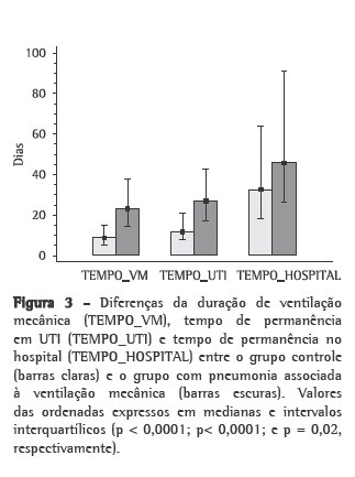 Comparando os pacientes com PAVM com o grupo controle, o tempo de VM (mediana: 23 dias; II: 15-37 vs. mediana = 9 dias; II: 5-15; p < 0,0001) o tempo de internação na UTI (mediana = 27 dias; II: 17-42 vs. mediana = 12 dias; II: 8-21; p < 0,0001) e o tempo de permanência no hospital (mediana = 46 dias; II: 25-90 vs. mediana = 33 dias; II: 18-64; p = 0,02) foram significativamente maiores (Figura 3).