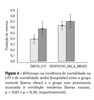 Não houve diferença significativa na mortalidade hospitalar entre os pacientes que desenvolveram PAVM (67%; IC95%: 56-79) e os controles (59%; IC95%: 51-66). No entanto, a mortalidade na UTI foi significativamente maior no grupo com PAVM (55%; IC95%: 42-67 vs. 38%; IC95%: 31-45; p = 0,02; Figura 4) e sua contribuição como fator de risco independente para óbito na UTI pôde ser verificada por regressão logística múltipla (OR = 3,01; IC95%: 1,36-6,66; p = 0,006). Outros fatores de risco independentes para mortalidade na UTI foram insuficiência renal aguda (OR = 3,99; IC95%: 2,10-7,59; p < 0,0001); choque (OR = 4,66; IC95%: 2,08-10,41; p = 0,0002); traqueostomia (OR = 0,17; IC95%: 0,07-0,36; p < 0,0001); e sexo masculino (OR = 0,36; IC95%: 0,18-0,71; p < 0,0034).