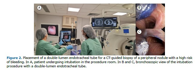 In addition to diagnosis, airway management during interventional procedures represents another point of convergence between these specialties. Bronchoscopy allows intubation of difficult airways and placement of double-lumen tubes during percutaneous interventions (Figure 2). It also plays a role in managing hemoptysis resulting from transthoracic biopsies, assisting with the placement of endobronchial blockers and the application of other hemostatic measures, thus ensuring rapid and effective bleeding control. In turn, interventional radiology promptly detects and treats pneumothorax following transbronchial biopsy by performing image-guided chest tube drainage. This synergy and immediate response enhance safety standards and ensure timely management of adverse events.(3)