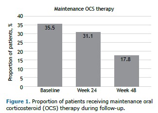 At baseline, approximately 35% of patients were receiving maintenance OCS therapy. As can be seen in Table 1 and Figure 1, there was a relative reduction of approximately 49% in the proportion of patients using OCSs by week 48, decreasing from 35.5% to 17.8%.