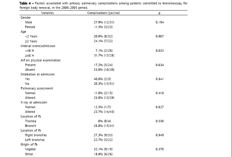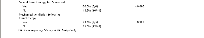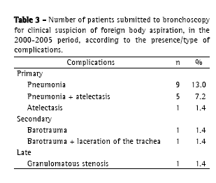 authors have reported the occurrence of pneumomediastinum.( 10) In another study,(11) pneumothorax was observed. However, neither of those conditions is common. In a sample of 304 patients, another group of authors observed that older children with a foreign body in the right bronchus and submitted to more than one bronchoscopy presented a higher risk of complications.(20) In our study, all 5 patients who required a second bronchoscopic procedure presented complications.