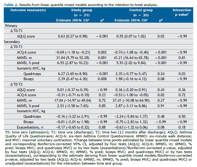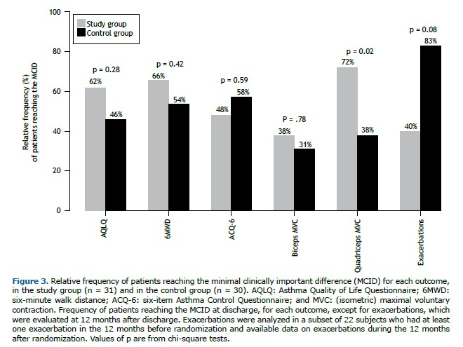 At T2, the number of exacerbations during the previous 12 months was recorded. Exacerbations were defined as a progressive increase in symptoms and decrease in lung function, requiring a change in medications.(30) The assessors who conducted the evaluations were blinded to the group allocation. Details of the measurements, including their minimal clinically important difference (MCID) values for outcome measures, are shown in the supplementary material.