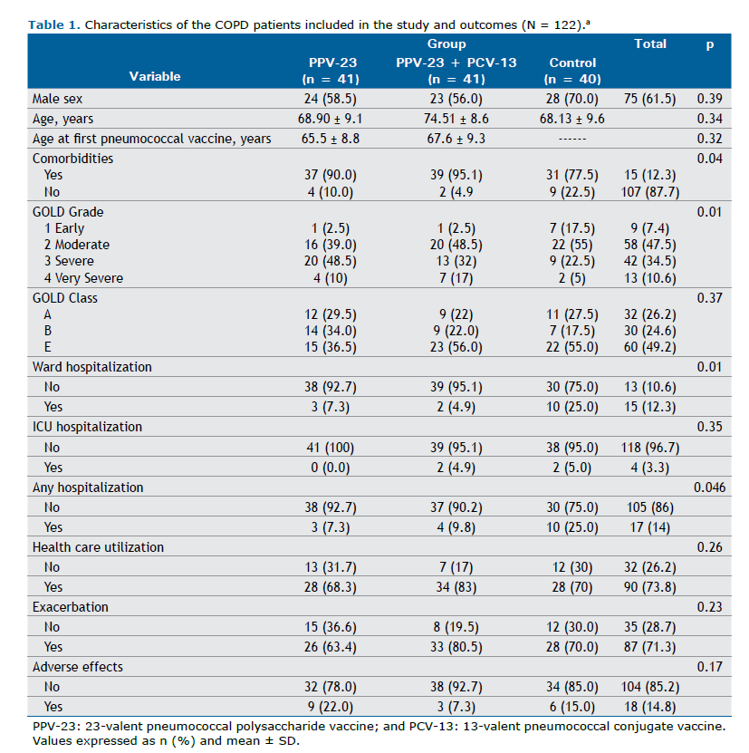 One previous study evaluated PCV-13 vaccination and its impact on COPD exacerbations.(7) There was no significant difference in relation to the rate of exacerbations, but the absence of PCV-13 vaccination almost tripled the risk of hospitalizations.