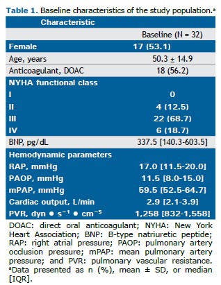 In an international registry of patients in Europe and Canada,(20) 50.1% of the patients were male, with a mean age of 63 years. Hemodynamic results showed an mPAP of 47 mmHg, a PVR of 709 dyn • s−1 • cm−5, and a cardiac index of 2.2 L • min−1 • m−2.(20) Similarly, in a study reporting results from the United Kingdom National Cohort,(21) the mean age was 57 years, with 53% of the patients being male. Hemodynamic findings included a mean baseline mPAP of 47 mmHg and a PVR of 830 dyn • s−1 • cm−5.(21) Although our patient population was younger, they presented with more severe hemodynamic impairment and were therefore selected for medical treatment prior to PEA.