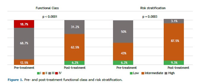 After a median treatment follow-up of 13.2 months (IQR, 10-22), we observed a significant improvement in functional class, with the proportion of patients in functional class III or IV decreasing from 87.5% to 31.2% (p < 0.001). Prior to treatment, 50% of the patients were classified as being high-risk patients. Following treatment, only 3.10% remained in the high-risk category, with the majority transitioning to intermediate risk (Figure 1). This was accompanied by a significant decrease in BNP levels and an improved hemodynamic profile (Figure 2 and Table 2), including a 38% reduction in PVR, driven by a 43% increase in cardiac output, a 7% decrease in mean pulmonary artery pressure (mPAP; Figure 2), and a 29% reduction in right atrial pressure (Table 2). All patients underwent hemodynamic assessment before and after treatment. BNP levels were available for all patients at baseline but only for 26 at the follow-up evaluation. Neither rehabilitation nor angioplasty was performed. No severe side effects were observed during the follow-up period.