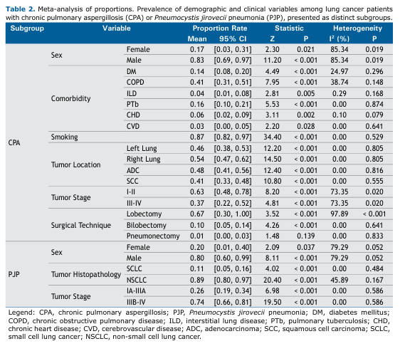 Potential Implications of Observed Heterogeneity Several instances of elevated heterogeneity were observed across our analyses, particularly in the meta-analyses of proportions. Initial pooled prevalence estimates for CPA and PJP showed substantial heterogeneity (I² > 90%), which was mitigated through subgroup analyses and stepwise exclusion of outlier studies. Residual high heterogeneity was mainly confined to descriptive variables, such as sex distribution and the proportion of lobectomy among CPA patients. While informative, these were not central to our clinical interpretations.