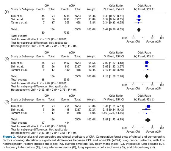 Compared with non-CPA patients, CPA patients had significantly higher odds of male sex (OR: 3.11, 95%CI: [1.38–6.98]), smoking (OR: 3.92, 95%CI: [2.56–6.00]), COPD (OR: 2.22, 95%CI: [1.07–4.56]), interstitial lung disease (OR: 4.45, 95%CI: [2.23–8.86]), pulmonary tuberculosis (OR: 1.63, 95%CI: [1.06–2.49]), and squamous cell carcinoma (OR: 2.20, 95%CI: [1.60–2.98]). Conversely, adenocarcinoma was associated with significantly lower odds in CPA patients (OR: 0.41, 95%CI: [0.30–0.55]).