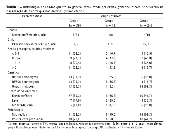 A média da idade dos pacientes foi de 12,5 ± 5,1 anos (variação: 6,1-26,4 anos). As distribuições em relação a gênero, cor da pele, renda familiar per capita e escores de Shwachman são apresentadas na Tabela 1.