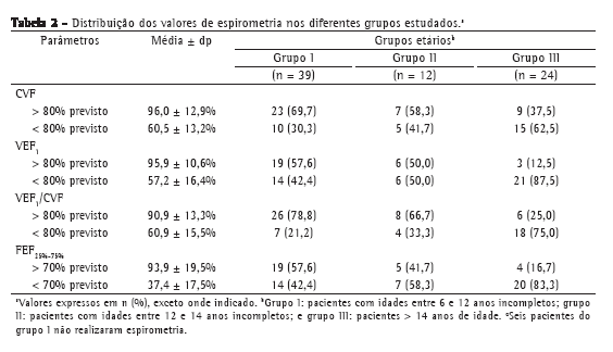 Os dados referentes à espirometria são apresentados na Tabela 2. Dos 75 pacientes, 41 apresentavam VEF1 < 80% do previsto (média = 57,2 ± 16,4%), 30 apresentavam CVF < 80% (média = 60,5 ± 13,3%), 41 FEF25-75% < 70% (média = 37,4 ± 17,5%), e 29 apresentavam a relação VEF1/CVF < 80% do previsto (média = 60,9 ± 15,5%). No grupo I, 14 pacientes (42,4%) tinham VEF1 < 80% do previsto, o mesmo ocorrendo em 6 (50,0%) do grupo II e em 21 (87,5%) do grupo III.