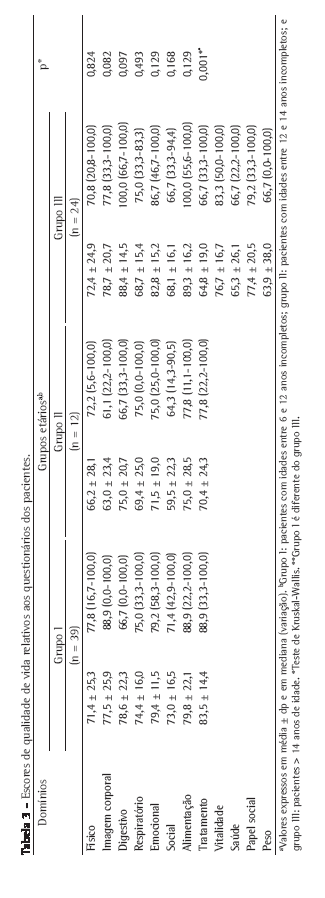 No grupo I, as médias dos escores variaram de 71,4 no domínio físico a 83,5 no domínio tratamento. No grupo II, essas variaram de 59,5 no domínio social a 75,0 nos domínios digestivo e nutrição. No grupo III, a média dos escores variou de 63,9 no domínio peso a 89,3 no domínio nutrição. Quando comparamos as médias dos escores dos três grupos, somente observamos uma diferença estatisticamente significante entre o grupo I e o grupo III no domínio tratamento (p = 0,001; Tabela 3).