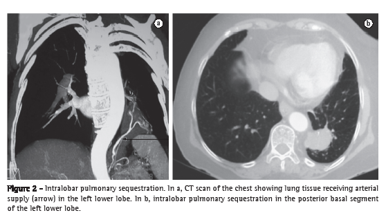 Pulmonary sequestration accounts for 0.15-6.45% of all lung malformations(9-14) and is characterized by normal, nonfunctioning lung tissue that has no connection with the bronchial tree and receives its blood supply from the systemic circulation.(4,10,12-14) Pulmonary sequestrations can be classified as extralobar or intralobar depending on their location in relation to the adjacent normal lung and on their visceral pleural covering.(4,10,11,15) There is a third, rarer, type of pulmonary sequestration designated bronchopulmonary foregut malformation, in which an abnormal lung is connected to the gastrointestinal tract.(16) Extralobar pulmonary sequestration, also known as accessory lung,(5) is covered by visceral pleura and separated from the functioning lung, whereas intralobar pulmonary sequestration can be completely covered by normal lung tissue or by a segment of the visceral pleura of the lung lobe within which the sequestration occurs.(11-14)