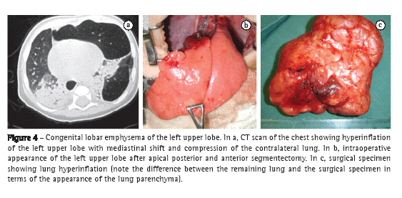 The clinical presentation of congenital lobar emphysema varies widely, from mild lung disease to acute respiratory failure at birth and recurrent pulmonary infections,(46,50) most patients being asymptomatic in the immediate postnatal period.(46) According to one group of authors,(46) although the vast majority of patients present with symptoms before age 6 months, some can remain asymptomatic for years.(46,47) Congenital lobar emphysema is twice as common in males as it is in females(47,49) and affects, in order of frequency, the left upper lobe (in 40-50% of cases),(50,51) the middle lobe (in 30-40%), and the right upper lobe (in 20%),(49,52) although bilateral involvement has also been described.(49) One third of all patients are symptomatic at birth, and 50% are diagnosed in the first month of life. Up to 10% of patients with congenital lobar emphysema present with associated abnormalities, the most common being cardiac abnormalities.(4) Most patients present with moderate degrees of respiratory dysfunction in the first days of life. Respiratory dysfunction worsens progressively with the passing of days as a result of increased lung hyperinflation. Patients with congenital lobar emphysema tend to present with cyanosis, which can progress to frank respiratory failure.(50)