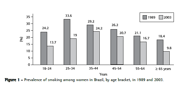 In Brazil, since 2001, successive epidemiological surveys have been conducted, and the results have shown that the prevalence of smoking has decreased in relation to that found in 1989, when the first nationwide study was conducted. Prior to 2000, the study conducted in 1989 was the only nationwide study of the prevalence of smoking. In 1989, the prevalence of smoking among women was 27%, having decreased to 18% in 2003 and to 13% in 2008. In addition, the rates of smoking among men and women have shown a trend toward convergence. The prevalence of smoking has been reported to be highest among women who live in rural areas, those with a lower level of education, and those with a lower income (Figures 1 to 4).(7)