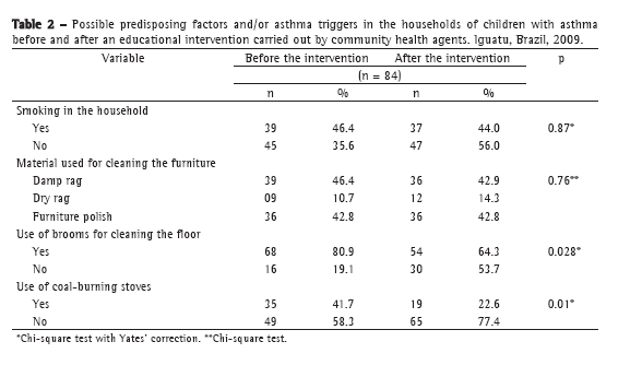 The present study has several limitations, one of which is that it involved caregivers with various levels of education. In addition, because there were no tools to assess the performance of the CHAs responsible for the counseling of the families of the children with asthma, 16 caregivers (19.0%) did not receive home visits, which prevented the adoption of preventive measures to improve the environmental conditions in those households. It is speculated that failures to carry out home visits are attributable to the large number of activities undertaken by the CHAs, activities that include bureaucratic tasks, records, and attention to other policies of the Brazilian National Ministry of Health, such activities receiving more attention and closer monitoring. In practice, however, there is no national asthma control policy promoting the continuity of follow-up at primary health care clinics and involving all of the social actors (health care managers, health professionals, and community leaders).