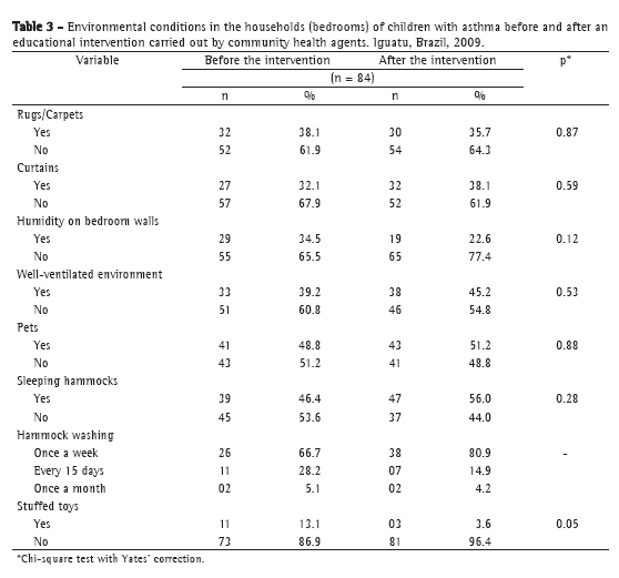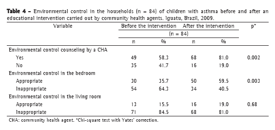 Asthma educational interventions that can reduce emergency room visits and hospitalizations, as well as school and work absenteeism, and in which the approaches and methods have various configurations, have been extensively studied worldwide. In a randomized study of 567 adults with persistent asthma in the United Kingdom, two groups were evaluated (one in which asthma self-management education was delivered by nurses and one in which this education was delivered by lay people trained for the task). Patients in both groups were provided with individualized action plans and received telephone follow-up. The results reported, in terms of unscheduled medical visits, courses of corticosteroids, and patient satisfaction, were similar between the two groups.(16) However, in the present study, we did not analyze this aspect (the type of instructor). Instead, we analyzed changes in environmental control, changes that in fact occurred, indicating that most of the CHAs understood the content of the educational intervention and provided information to the caregivers, which resulted in changes in the aeroallergen levels within the home environments. Nevertheless, the findings of the aforementioned study conducted in the United Kingdom indicate that, when properly trained, mid-level professionals, such as CHAs, can provide counseling that is appropriate to the situation of asthma patients, making it possible to improve the environmental control of aeroallergens, which can improve patient quality of life. In a study conducted in Canada, children, adolescents, and their parents participated in small focus groups of six to eight families for four weeks, during which time educational brochures and leaflets were distributed and families exchanged experiences.(17) The authors reported that, within a one-year period, there was a significant reduction in the rate of hospitalization, the number of courses of oral corticosteroids required, and the number of workdays missed by parents. Those findings differ from the results reported in the aforementioned study conducted in the United Kingdom.(16) Therefore, we should be careful about generalizations, always taking into consideration the socioeconomic and cultural characteristics of the population under study.