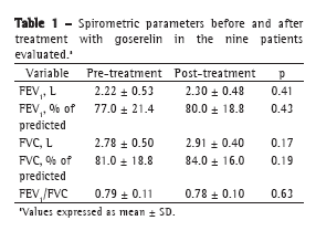 Table 1 shows the spirometric values, which are expressed as means and standard deviations. None of the patients had a positive bronchodilator response in the spirometric test performed before antihormone therapy. After one year of treatment with goserelin, the mean increase in FEV1 was 80 mL and the mean increase in FVC was 130 mL. However, the difference was not statistically significant. The mean FEV1/FVC ratio did not vary. Of the nine patients evaluated, five showed increased FEV1, three showed no variation in FEV1, and only one showed reduced FEV1.