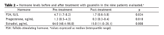 Table 2 shows the hormone levels, which are expressed as medians and interquartile ranges. After one year of treatment with goserelin, there was effective hormonal blockade, with a significant reduction in the median levels of FSH (to values below the lower limit of normality for adult women), estradiol, and progesterone (to values below the lower limit of normality for adult women and within the range of reference values for postmenopausal women). The medication was well tolerated by all patients, and there were no significant adverse effects.