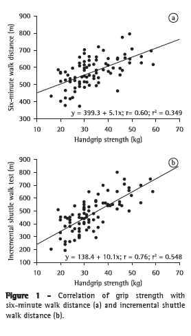 The assessment of grip strength (GS) has broad clinical applicability, because it is a low-cost, simple, rapid, and noninvasive method,(12,13) providing an indicator of general health and overall muscle function.(12) Various authors have found GC to correlate significantly and positively with 6MWD and ISWD, especially in patients with COPD.(7,14-16) In healthy elderly individuals, GS has been identified as a determinant of 6MWD.(7)