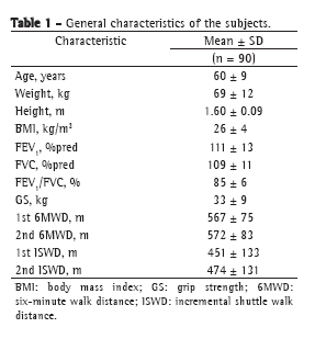 The characteristics of the 90 subjects (40 males) are summarized in Table 1. All of the subjects had normal lung function. The age distribution of our sample was as follows: 40-49 years (n = 20); 50-59 years (n = 21); 60-69 years (n = 26); and ≥ 70 years (n = 23). Mean BMI was within the overweight range (28 ± 3 kg/m2). Approximately 52% of the subjects were classified as sedentary. The GS, 6MWD, and ISWD values were greater in males than in females (43 ± 7 vs. 28 ± 5 kg, 641 ± 63 vs. 540 ± 72 m, and 600 ± 91 vs. 417 ± 103 m, respectively; p < 0.001 for all).