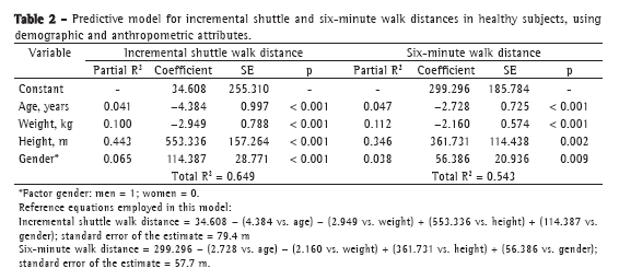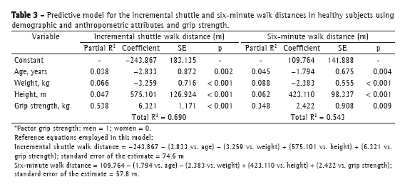 The main limitation of the present study was the use of a convenience sample, which might have introduced a selection bias. However, this type of sample has often been used in studies evaluating reference values for the total distance walked on field walking tests.(3-7,10) The GS values, in combination with demographic and anthropometric attributes, did not increase the R2 values of the standard equations. This might be attributable to the fact that GS was consistently correlated with age, height, and weight, or there might have been multicollinearity among variables in the alternate models, which could also explain that finding. However, the variance inflation factor values were < 4, indicating that there was no such multicollinearity in the alternate models.