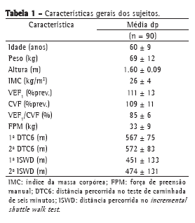 As características dos 90 sujeitos (40 homens) encontram-se resumidas na Tabela 1. Todos os sujeitos tinham função pulmonar normal. A distribuição etária da nossa amostra foi a seguinte: 40-49 anos (n = 20); 50-59 anos (n = 21); 60-69 anos (n = 26); e ≥ 70 anos (n = 23). A média do IMC ficou na faixa de sobrepeso (28 ± 3 kg/m2). Aproximadamente 52% dos sujeitos foram classificados como sedentários. Os valores de FPM, DTC6 e ISWD foram maiores nos homens que nas mulheres (43 ± 7 vs. 28 ± 5 kg, 641 ± 63 vs. 540 ± 72 m, e 600 ± 91 vs. 417 ± 103 m, respectivamente; p < 0,001 para todos).