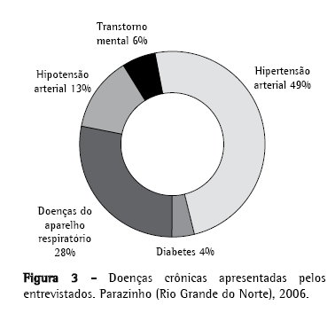 Segundo a PNSN, havia naquela época uma maior proporção de fumantes na zona rural,(2,11) o que está em desacordo com o nosso trabalho, segundo o qual foi possível constatar uma proporcionalidade semelhante em ambas as áreas. Este fato deve ser analisado com cautela, em virtude de o Doenças crônicas apresentadas pelos entrevistados. Parazinho (Rio Grande do Norte), 2006. município ser de pequeno porte populacional, onde não há uma distinção acentuada entre as zonas urbana e rural.