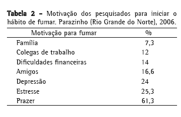 No município estudado, a proporção de pessoas que fumava apenas cigarros industrializados (30,6%) era praticamente a mesma das pessoas que fumavam somente cigarro de palha (29,3%), e 24% dos entrevistados diziam fazer uso dos dois tipos, simultaneamente. Quanto à motivação para fumar, a Tabela 2 mostra que 61,3% fumavam por prazer, 25,3% associavam o vício ao estresse e 24% usavam