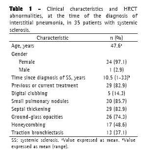 Table 1 shows the clinical characteristics and HRCT abnormalities of the sample at the time of the diagnosis of interstitial pneumonia. Of the 35 patients evaluated, 34 were women. The mean age was 47.6 years (range, 28-65 years).