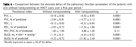 Finally, we compared the absolute deltas of the pulmonary function parameters of the patients with and without honeycombing on the HRCT scans over a five-year period (Table 4). With the exception of the FEV1/FVC ratio, there were statistically significant differences for all functional variables evaluated.