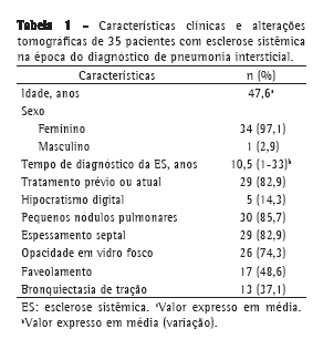 ResultadosAs características clínicas e as alterações tomográficas da amostra na época do diagnóstico da pneumonia intersticial estão demonstradas na Tabela 1. Dos 35 pacientes avaliados, 34 eram mulheres. A média de idade foi de 47,6 anos (variação: 28-65 anos).
