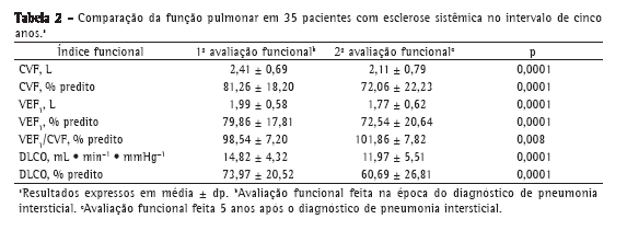 Considerando a amostra total, a média e o desvio-padrão das duas avaliações da função pulmonar são descritos na Tabela 2. A média do intervalo entre as mensurações foi de 60,9 meses (variação: 57-65 meses). Na primeira avaliação, a redução da CVF foi observada em 54,3% dos pacientes, enquanto 68,6% apresentaram queda da DLCO. Já na segunda avaliação, a diminuição da CVF foi notada em 60% dos doentes, enquanto 77,1% apresentaram queda da DLCO. Houve queda da CVF de pelo menos 10% e redução da DLCO de pelo menos 15% em 57,1% e 62,9% dos casos, respectivamente. Nessa amostra, nenhum paciente avaliado apresentava limitação ao fluxo aéreo. Quando comparados os valores obtidos nas duas avaliações, houve diferenças estatisticamente significativas entre as médias de todas as medidas funcionais avaliadas.