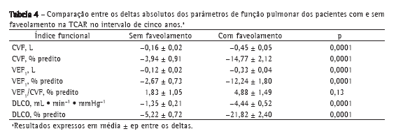 Por fim, foi realizada a comparação entre os deltas absolutos dos parâmetros de função pulmonar dos pacientes com e sem faveolamento na TCAR durante o intervalo de cinco anos (Tabela 4). Exceto para a relação VEF1/CVF, houve diferenças estatisticamente significativas para todas as variáveis funcionais avaliadas.