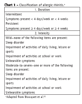 Although the onset of the clinical manifestations of AR occurs most commonly during childhood, up to 30% of patients present a later onset. Depending on the frequency of the symptoms, AR is classified as intermittent or persistent and, according to the intensity of the symptoms, as mild or moderate-to-severe (Chart 1).(1)