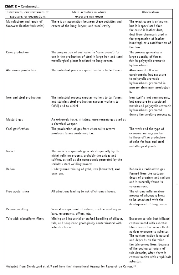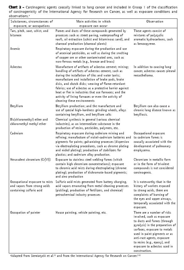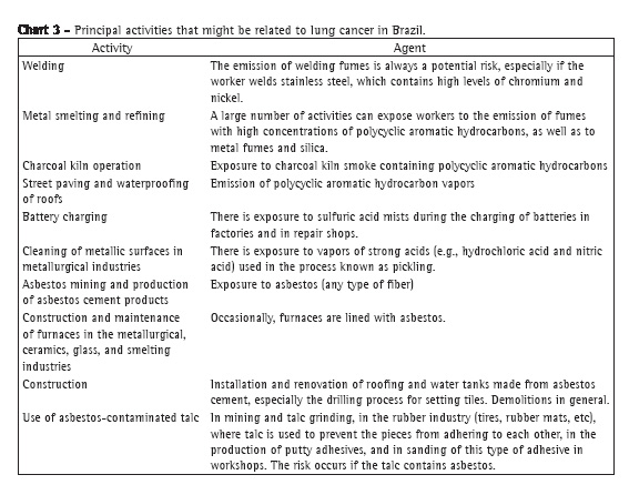 In order to facilitate the task of obtaining information on carcinogenic agents with which a patient might have had contact, a list of some activities and occupations that are common in Brazil and can involve exposure to agents classified as IARC Group 1 (Chart 3) was drawn up, in addition to the occupations, per se, classified as carcinogenic to the lung (Chart 2).