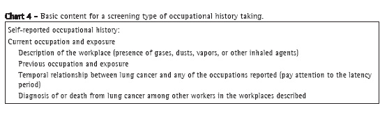 Lung cancer is not always etiologically related to occupational exposure. Therefore, occupational history taking can be conducted at two levels of depth: a general inquiry, that is, a type of basic screening for occupations and substances; and a detailing of the history, after the detection of something suspicious in the initial screening.(30-33)