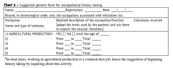 When the etiology is hypothesized to be occupational and a suspected exposure is identified in the screening, the workplaces where the patients have been employed and the occupations they have had in their professional life should be detailed.(32) To that end, an appropriate amount of time should be allocated in the medical appointment. It is not possible to obtain quality information in a hasty manner. This detailing should follow a script covering from first to current job, preferably using a standard pre-approved data collection worksheet (Chart 5). This step should include the following: