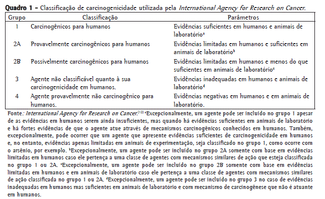 Essa classificação é revisada rotineiramente, e, na sua última atualização (16/01/2009), o grupo 1 é composto de 108 itens, entre os quais há substâncias puras, misturas, circunstâncias de exposições (várias delas ocupacionais) e hábitos. Embora a classificação não especifique o tipo de câncer causado, esse pode ser pesquisado nas monografias da IARC,(14) as quais indicam que o câncer de pulmão é um dos principais tipos de câncer da lista.